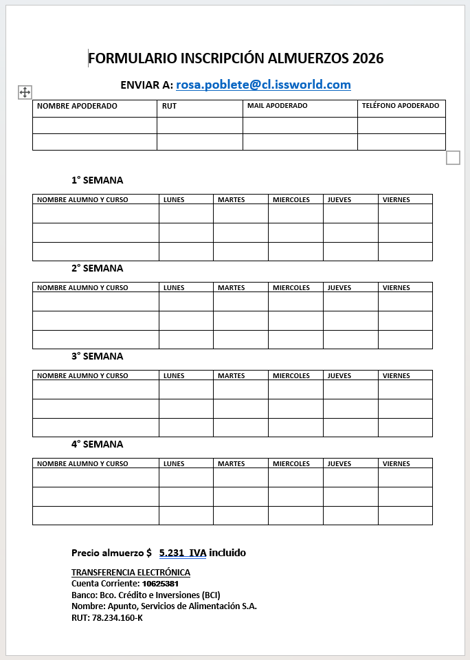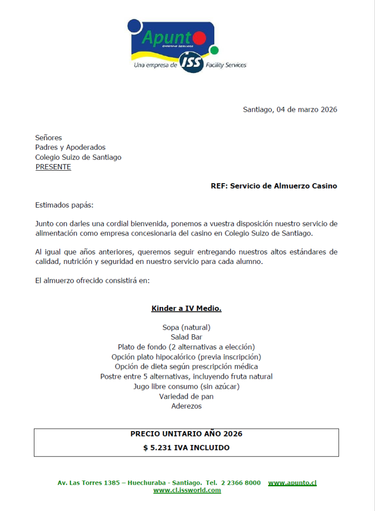 El Colegio está preocupado de desarrollar hábitos de alimentación saludable en todos sus niveles y modalidades de enseñanza. En este sentido, existe una coordinación muy cercana con Apunto, empresa de alimentación que administra el casino.
